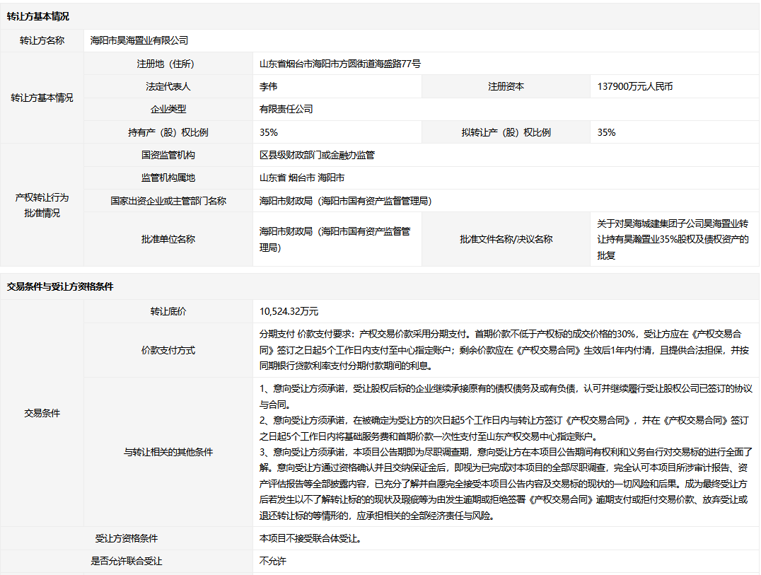 海陽市昊瀚置業(yè)有限公司35%股權及10487.55萬元債權