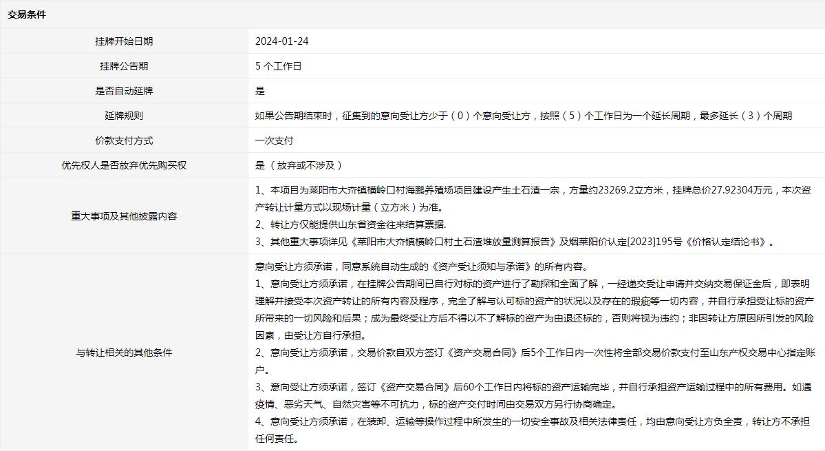 海陽市辛安鎮(zhèn)卓格莊村CX項目平整土地產(chǎn)生部分渣土一宗(3號標的)交易公告