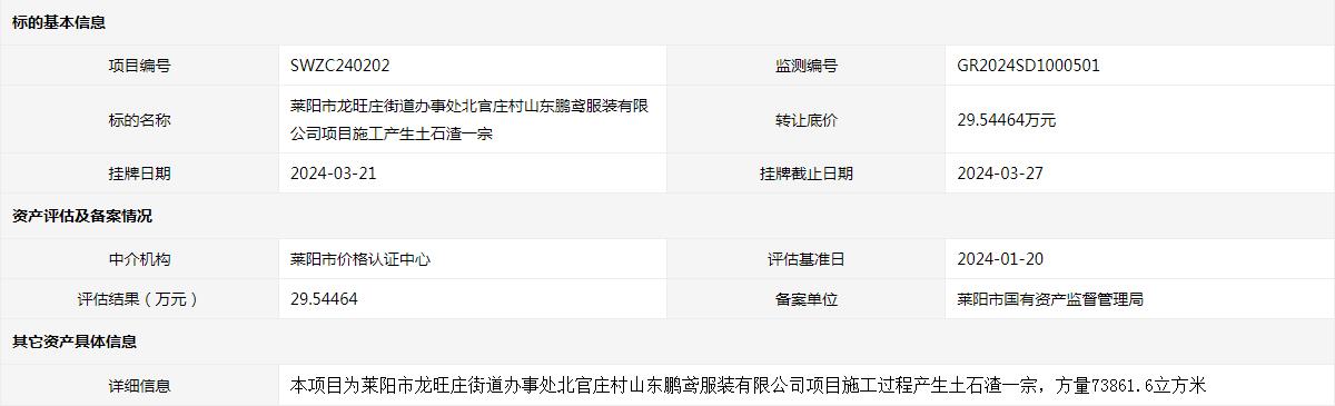 萊陽市龍旺莊街道辦事處北官莊村山東鵬鳶服裝有限公司項目施工產生土石渣一宗
