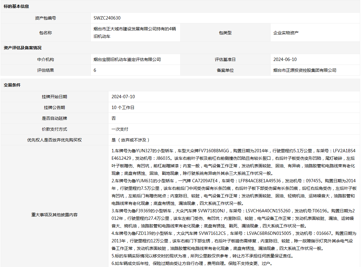 煙臺市正大城市建設發(fā)展有限公司持有的4輛舊機動車