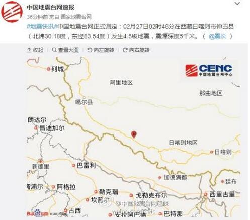 中新網(wǎng)2月27日電 據(jù)中國(guó)地震臺(tái)網(wǎng)正式測(cè)定:2月27日02時(shí)48分在西藏日喀則市仲巴縣(北緯30.18度,東經(jīng)83.54度)發(fā)生4.5級(jí)地震,震源深度5千米。