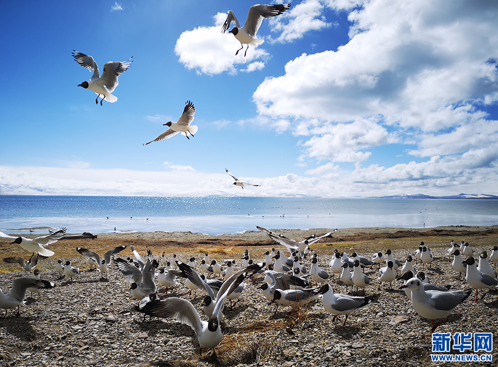 圣湖瑪旁雍措旁飛舞的海鷗。新華網(wǎng)記者 張宸攝