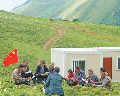 “如今,我們邊境牧民告別了土氈棚,全部住上了裝配式新牧房,還可以開車放牧、用太陽能發(fā)電打酥油!痹饔貌卣Z讀完黨的十九大報告中關(guān)于鄉(xiāng)村振興戰(zhàn)略的表述,結(jié)合新聞和邊境牧民生產(chǎn)生活條件的變化,娓娓道來。整個夏天都在這里放牧的黨員和牧民群眾圍坐在草場上,認真聆聽講解,不時插話、提問。