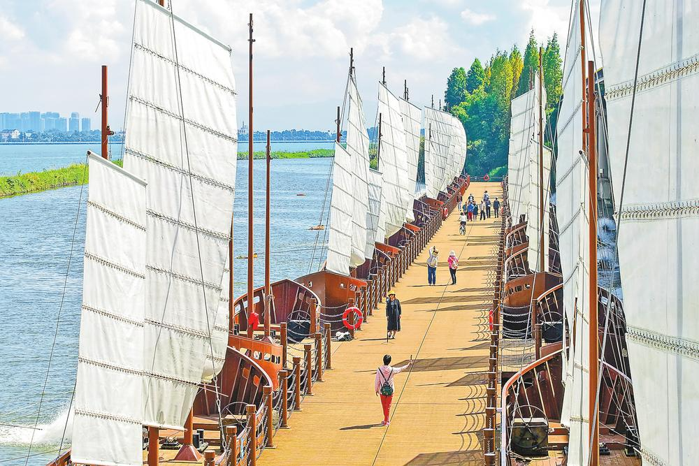 近日,昆明滇池綠道環(huán)草海段鋼浮橋重新向公眾開放。該橋是我省首座大型鋼浮橋,全長260米,以24組“帆船”造型藝術(shù)化再現(xiàn)“百舸爭流、千帆競發(fā)”的滇池古渡意象。該浮橋在2023年建成后曾對公眾開放過一段時間,后處于封閉狀態(tài)。此次重新開放,讓市民游客得以完整體驗(yàn)環(huán)滇池的自然風(fēng)光與人文景觀。圖為市民游客在鋼浮橋游覽。(記者 胡妤雅)