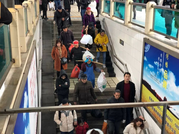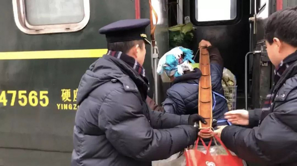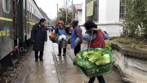 臨近年關(guān),剛下過一場(chǎng)冬雨,地面濕滑,仍有不少農(nóng)戶挑著自家的農(nóng)產(chǎn)品候車,他們大都要到凱里賣菜。為防止老人們摔倒,列車工作人員干脆擔(dān)當(dāng)起了“背簍工”。