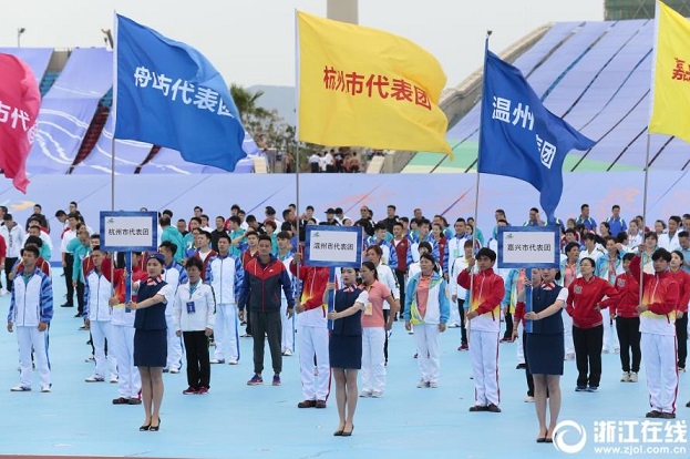 9月29日下午3時(shí),浙江省第三屆體育大會(huì)開幕式于舟山體育場(chǎng)隆重舉行。體育大會(huì)不同于省運(yùn)會(huì),項(xiàng)目設(shè)置都非常有趣,除了奧運(yùn)競(jìng)賽項(xiàng)目,還設(shè)有輪滑、橋牌、保齡球、龍舟等非奧運(yùn)項(xiàng)目。本屆體育大會(huì)共有11個(gè)地市、10個(gè)省級(jí)行業(yè)體協(xié)共21個(gè)代表團(tuán)報(bào)名參賽。截至目前,共5477名運(yùn)動(dòng)員報(bào)名參賽。(浙江在線記者 張孫超 沈逸軒 通訊員 方威畏 姚峰 攝)