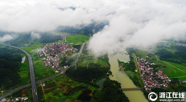 8月26日,航拍云霧繚繞的仙居縣官路鎮(zhèn)鄉(xiāng)間田園。