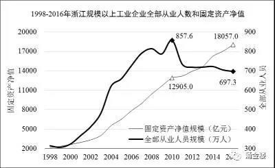 ▲1998-2016年浙江規(guī)模以上工業(yè)企業(yè)全部從業(yè)人員和固定資產(chǎn)凈增